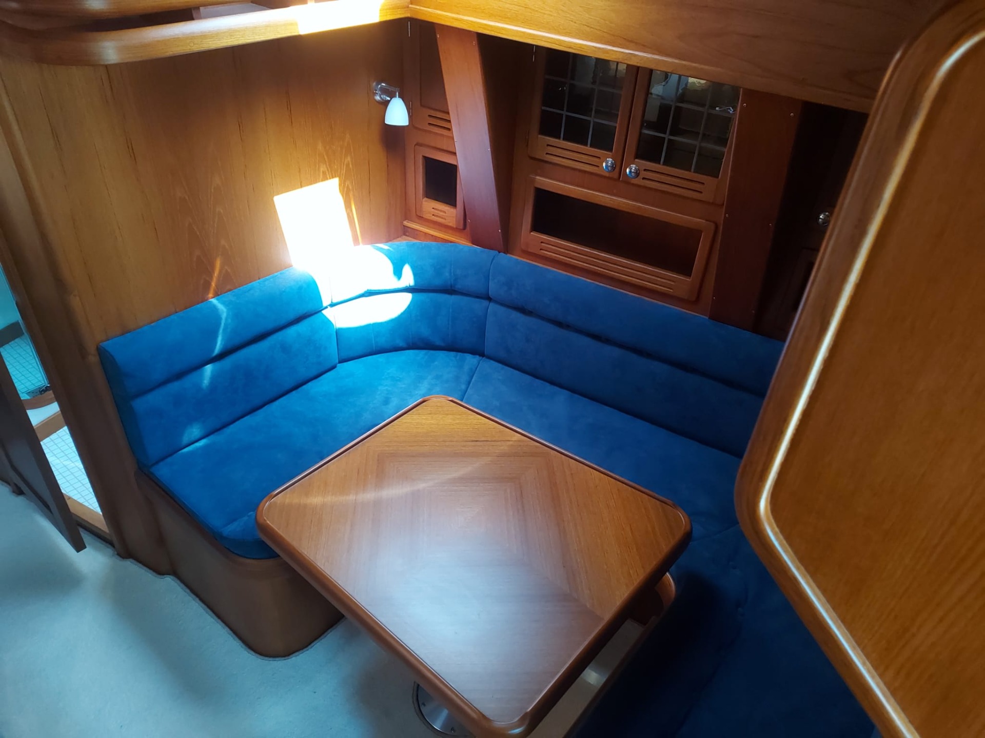 Obývací část v podpalubí: samostatný jídelní kout s dřevěným stolem a vykládanou růžicí kompasu
