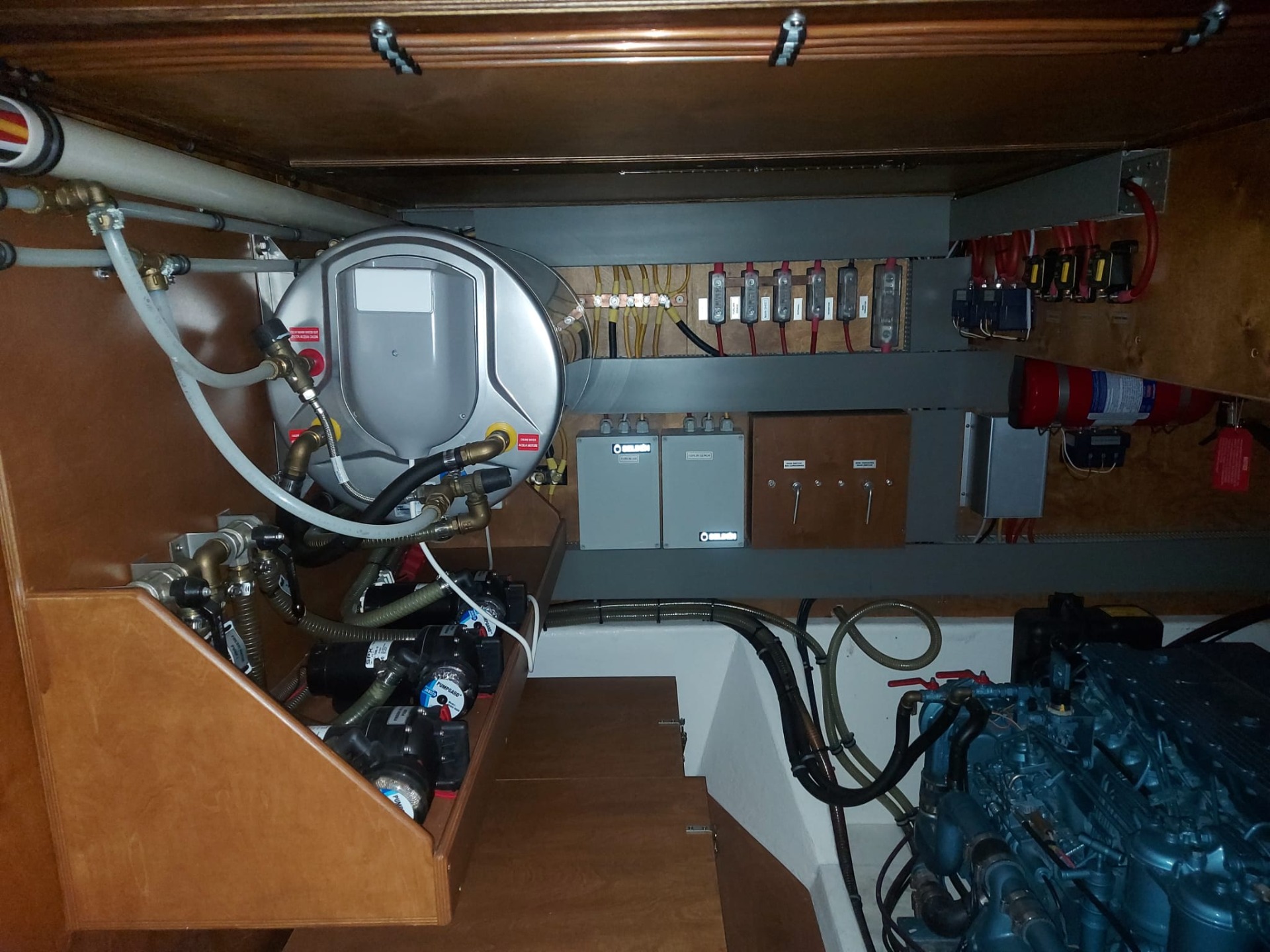 Vodní systém: tlaková voda, ohřev přes motor i el. bojler