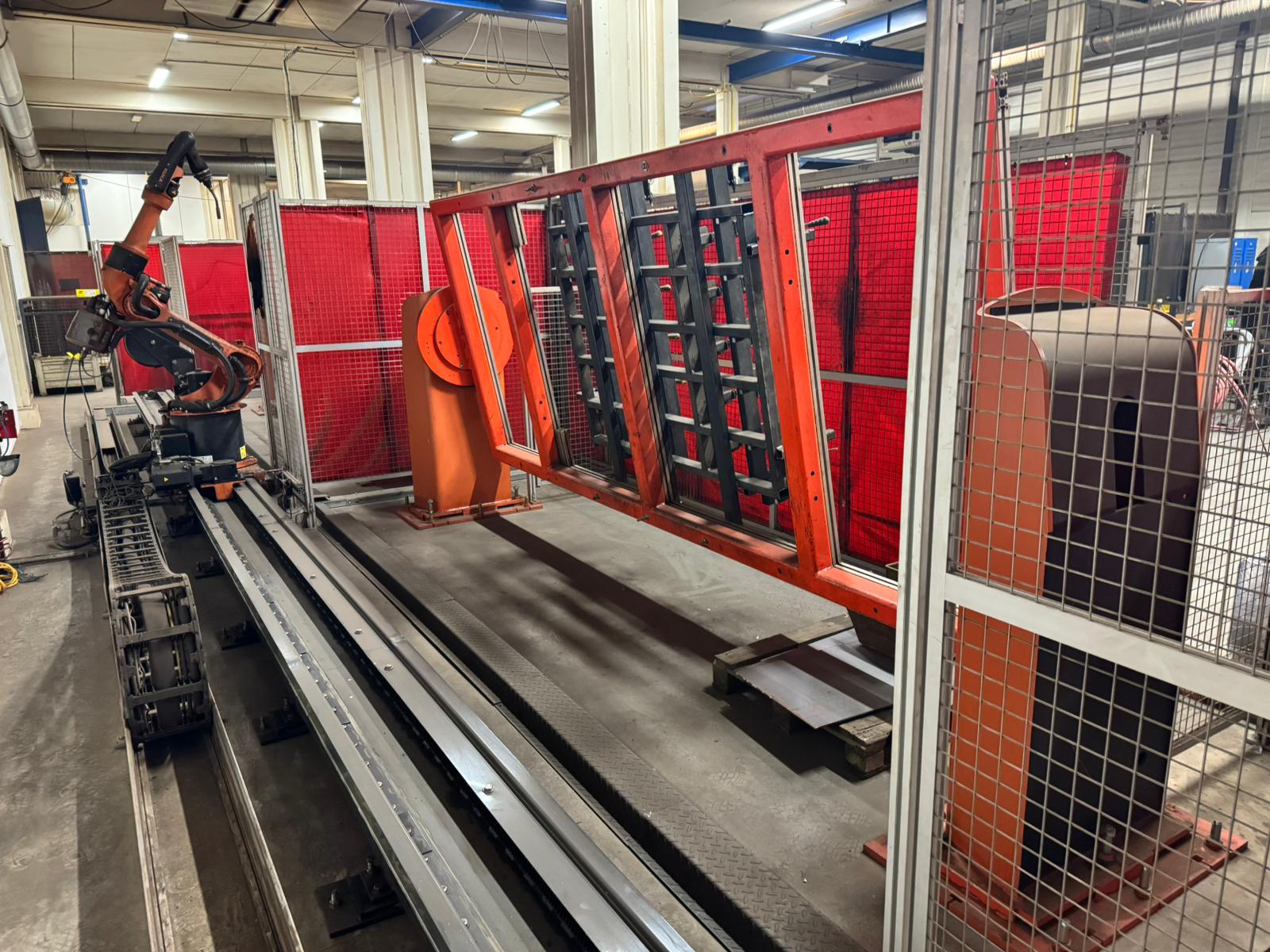2. Lineární pojezd a polohovadlo obrobků: Buňka využívá dvě masivní kinematické jednotky typu KP1 (KUKA Positioner 1-axis) – jednu pro pojezd robota a druhou pro rotační rám s obrobky.